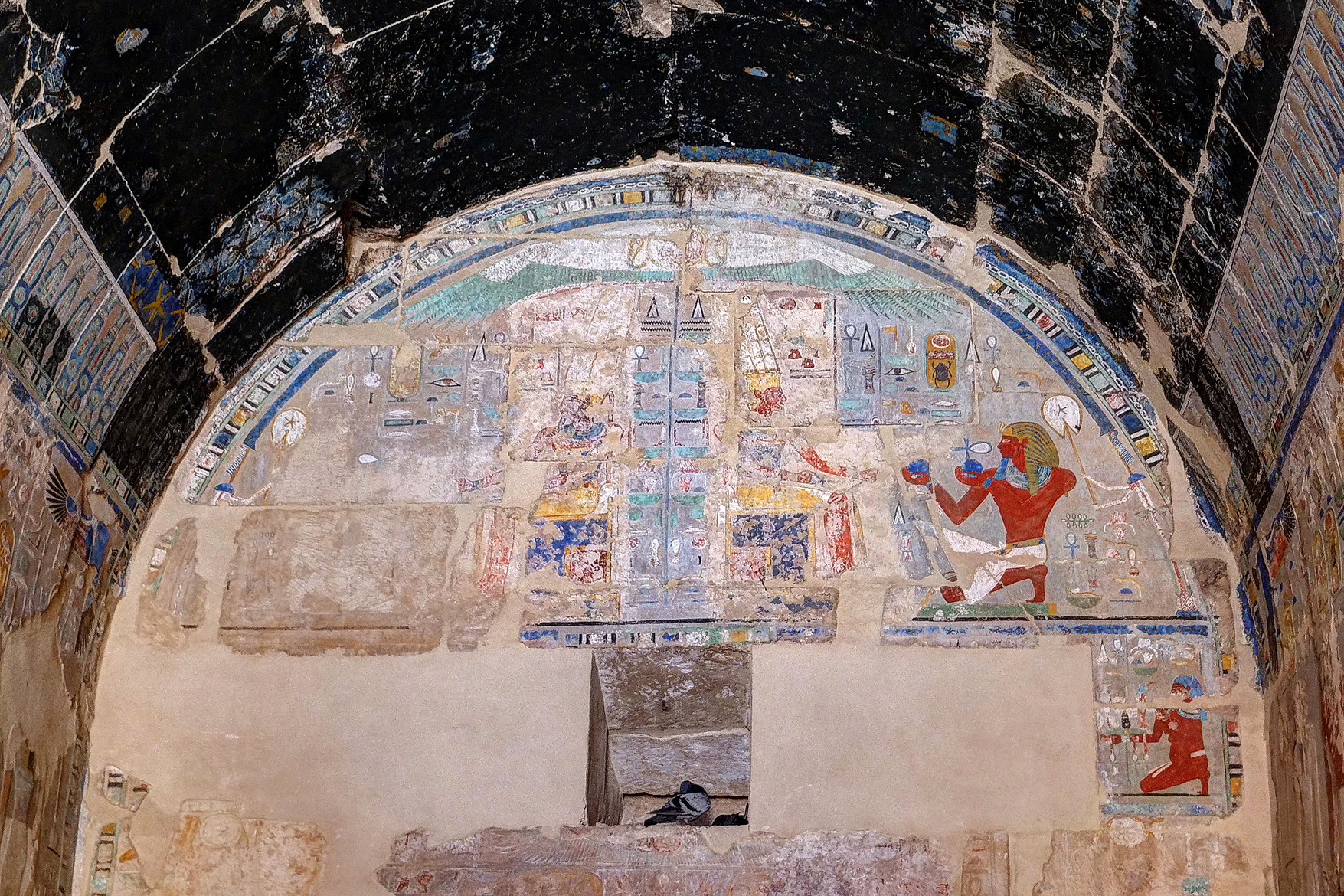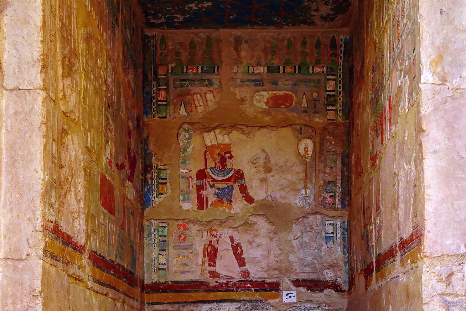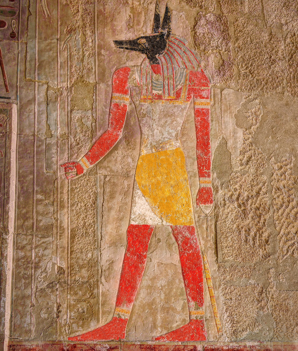 One of the largest chapels was dedicated to the important deity Anubis (picture 3, below). Like Hades in Greece and Yama in India, Anubis was the original Egyptian ruler of the underworld, where people end up after their deaths. He led the deceased into the realm of darkness. Later Osiris took his position, but Anubis remained an major deity, who was worshipped in special shrines. In his lead hand he carries the Was-Sceptre (a symbol of power and dominion), in his back hand he holds the Ankh (☥, symbolizing life). The Ankh was a very popular symbol in Egyptian culture. Gods gave life to the Pharaohs by handing them an Ankh. When the Coptic Christians started to convert Egyptians they used the Ankh as the Coptic cross and called it crux ansata. Nowadays the goth movement uses the symbol and it can be shown as ☥ on the computer.