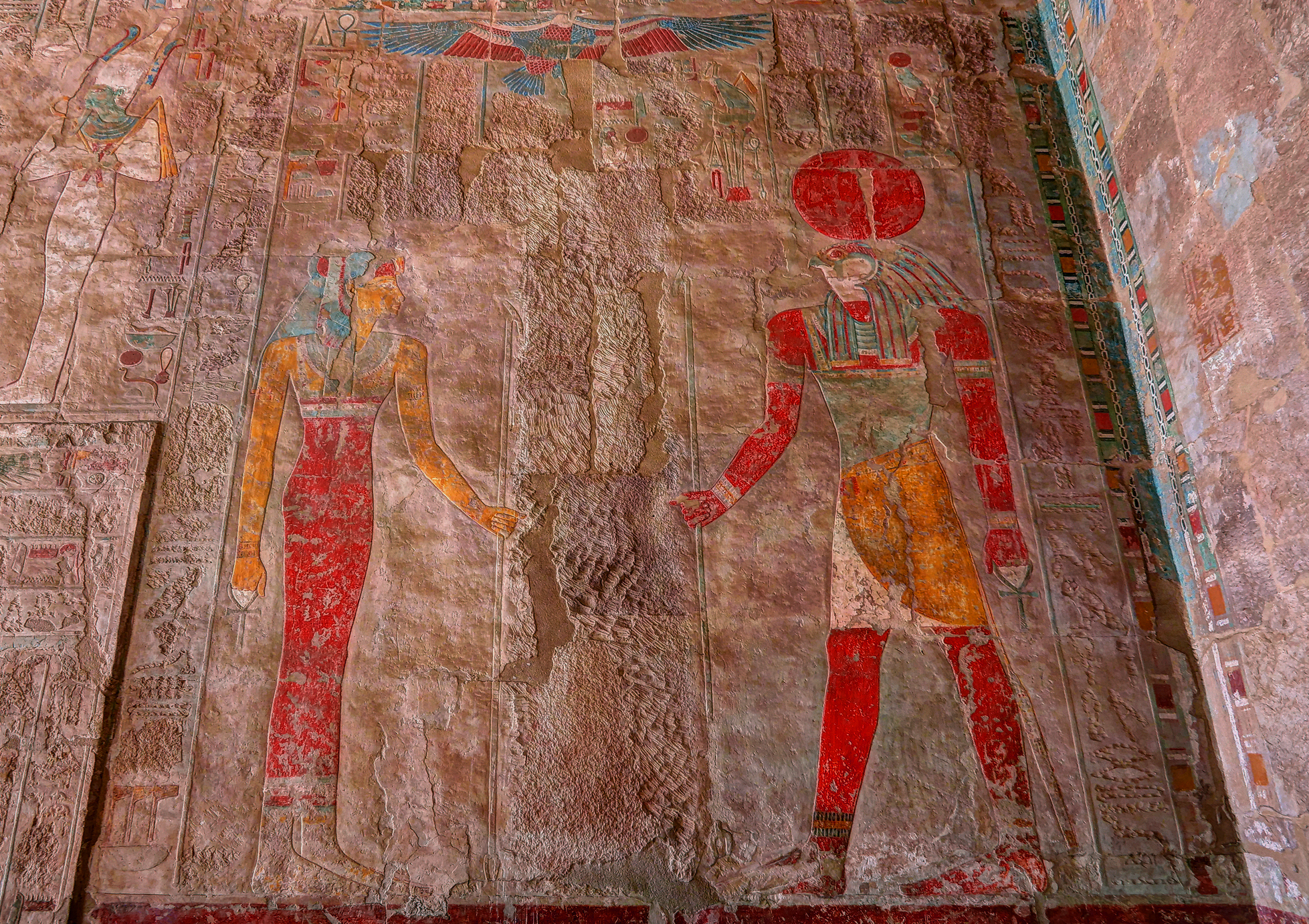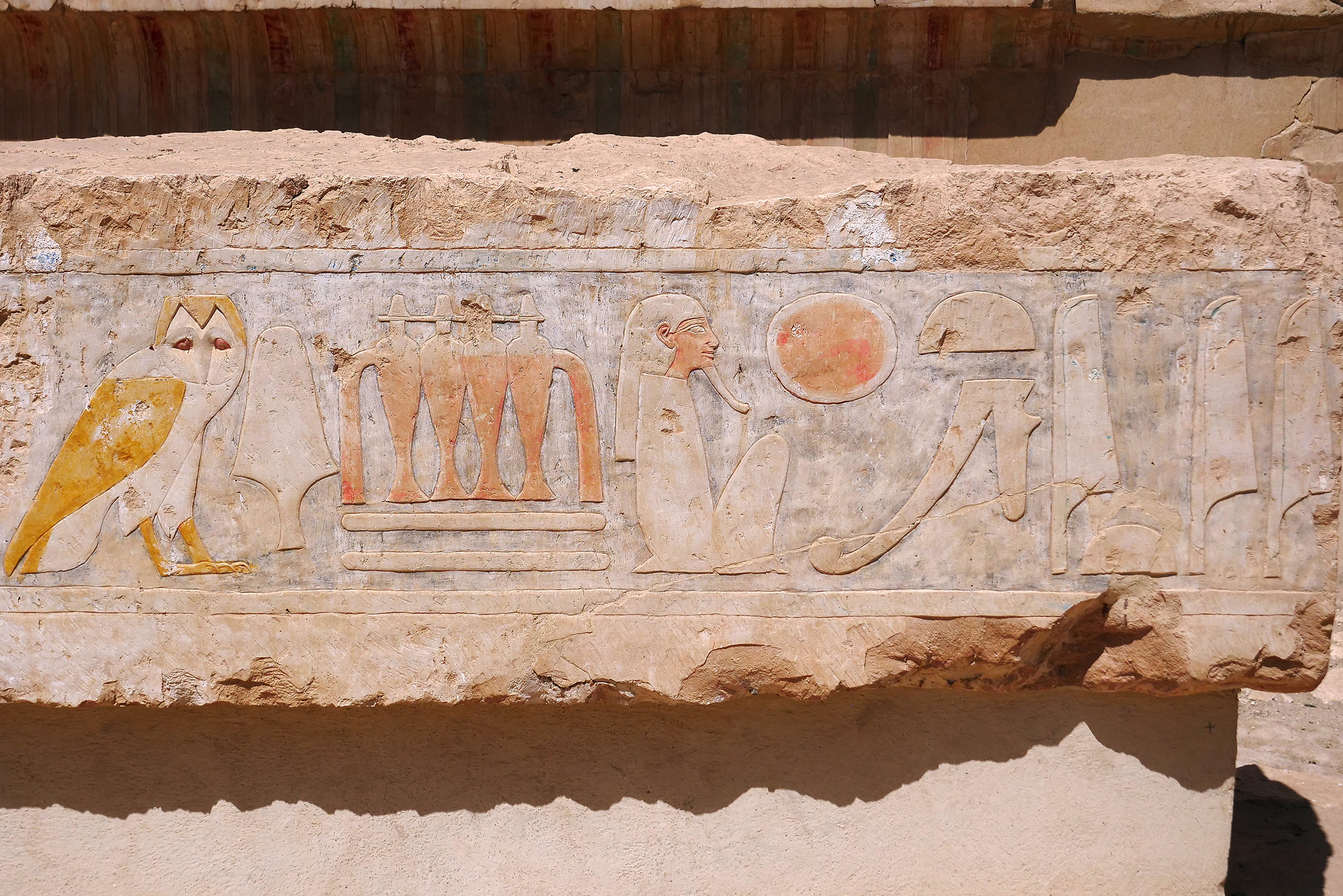 Picture 4 (below) shows us another oddity of Hatshepsut’s temple. On the left is a goddess (likely Hathor or Isis), and on the right is Ra-Horakhty (the Sun God Ra combined with “Horus of the Horizon”), recognizable by his falcon head topped with a sun disk. The two deities are essentially “pouring” life into the space between them where Hatchepsut’s picture used to be. This was a popular motif for the pharaos—to show their divine origin and legitimation for the common people. However, after her death, her stepson and successor, Thutmose III, ordered her images and names to be chiseled away. This wasn’t necessarily out of personal hatred, but to “fix” the historical record: by erasing her, he was re-establishing the traditional male-to-male succession from Thutmose II directly to himself.