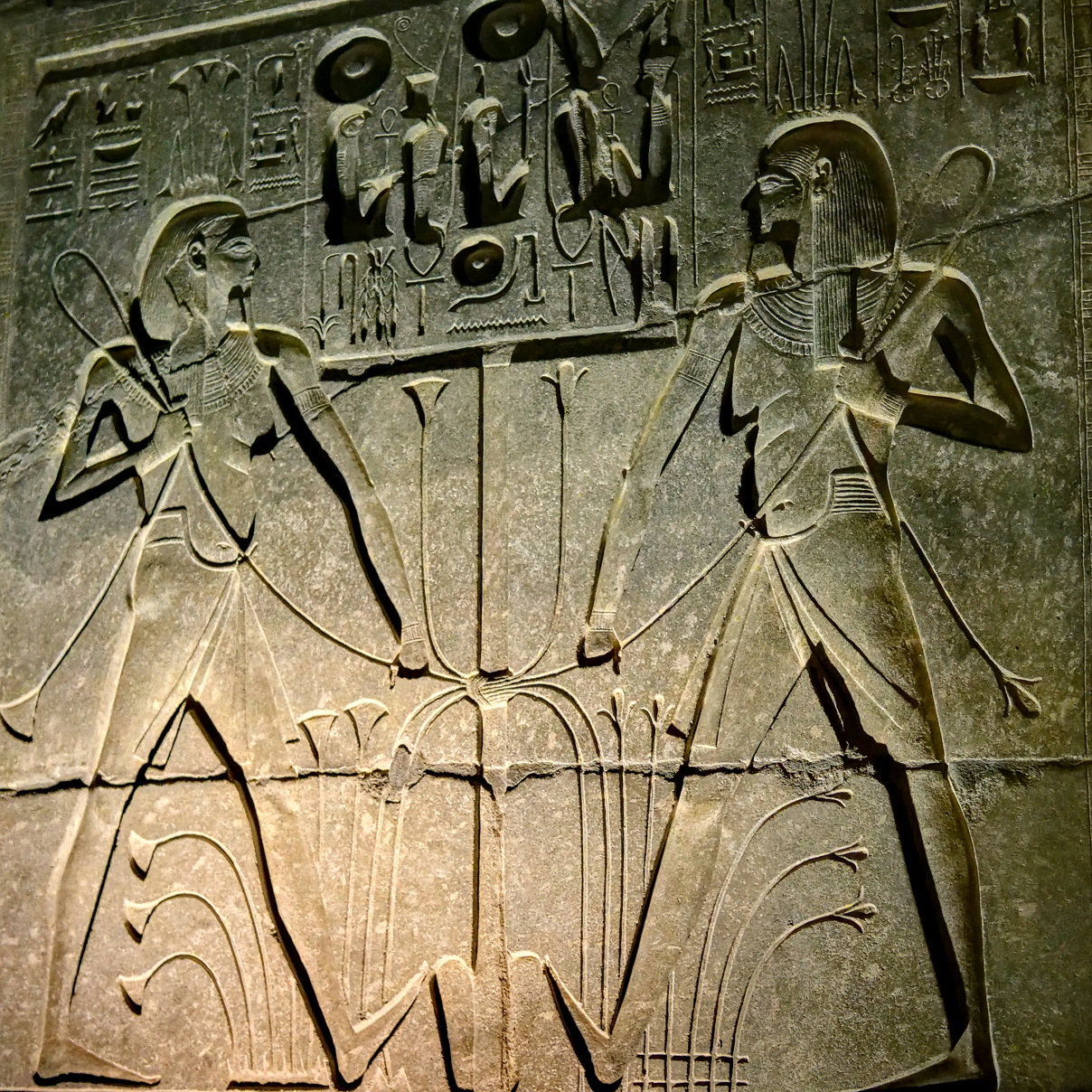 Photo 7: The Sema Tawy Ritual. This relief shows two figures of Hapi, the Nile god, binding the symbolic plants of Upper and Lower Egypt (lotus and papyrus) together. This ritual represents the core operating principle of the Egyptian state: two neighboring but geographically distinct regions tied into a single, balanced system of order.