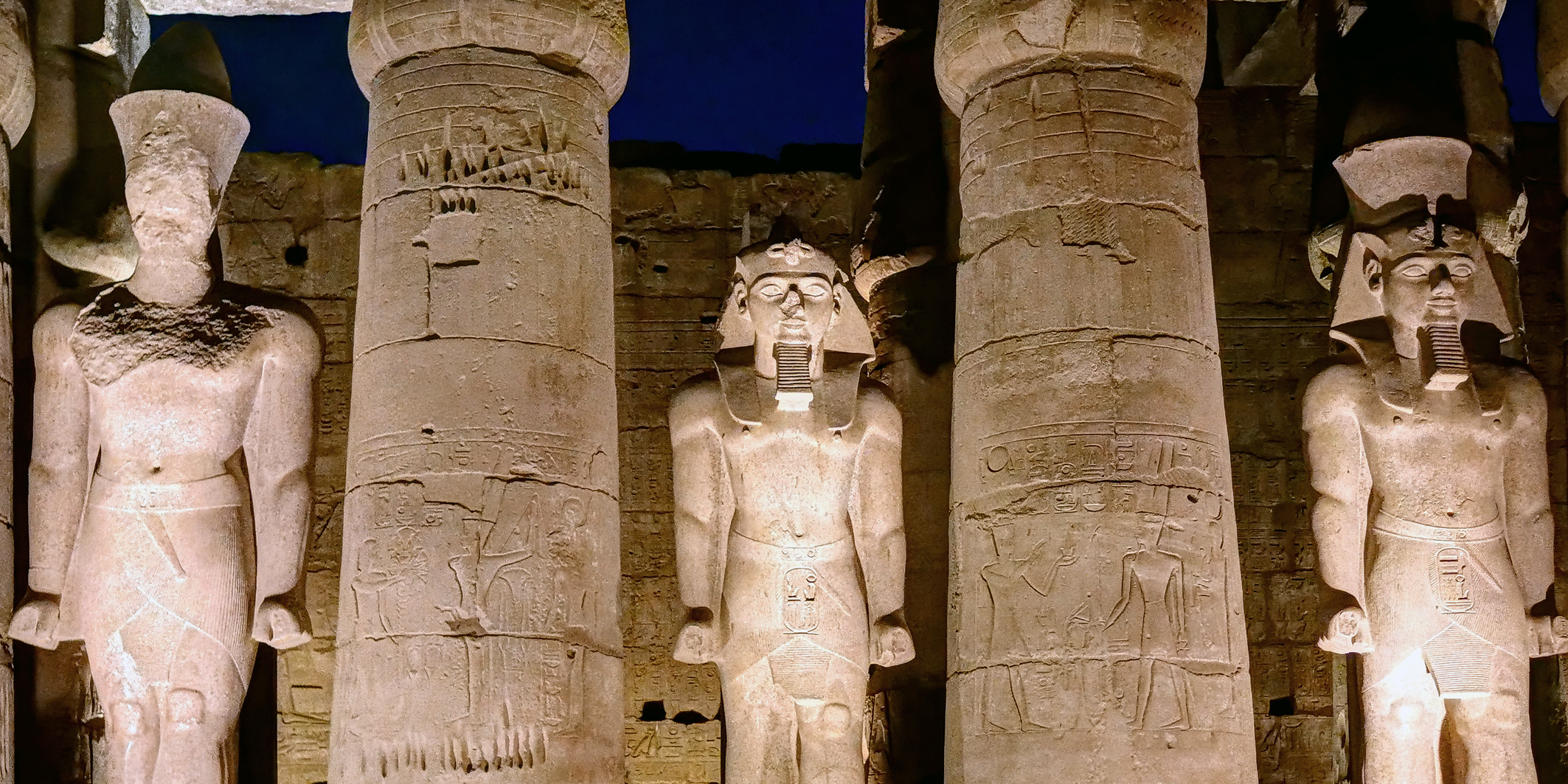 Photo 10: The Colossal Entrance at Night. Two statues of Ramesses II flank the entrance. In the dark, the shadows emphasize the imposing presence of the king who sought to ensure his image would survive any attempt at erasure.